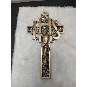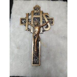 This beautiful wall hanging features a crucifix cross with intricate filigree detailing made of brass material. The golden tone adds a touch of elegance to any room. The figure of Jesus with INRI is solid and serves as a powerful reminder of faith, making it a great addition for any Christian collector. The item has been gently used and is in great condition.