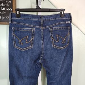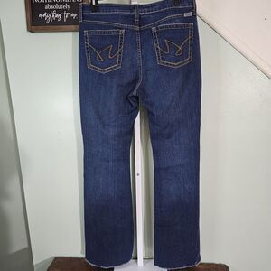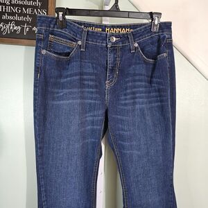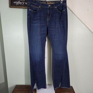 Cruel Girl Hannah Flare jeans in dark stone wash, size 33. Made of denim with a zip and button closure, featuring a 5-pocket design and a high rise. The jeans have a slim fit, flared style with a split raw hem and fray accents, giving them a Western theme. Machine washable and made of cotton by the brand Cruel Girl.