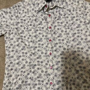 Charming button-down shirt with a black floral pattern on white. Ideal for casual outings. It is in very good condition. I have hardly worn it. SHIPPING WILL TAKE ME A FEW DAYS !