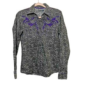 Stand out at your next rodeo, country concert, or Nashville trip with this bold Cruel Girl snap shirt. Features a striking black/grey patterned base with vivid purple tribal embroidery on the front and back. Classic pearl-style snaps, western yoke detailing, and a flattering feminine fit.