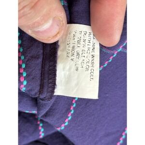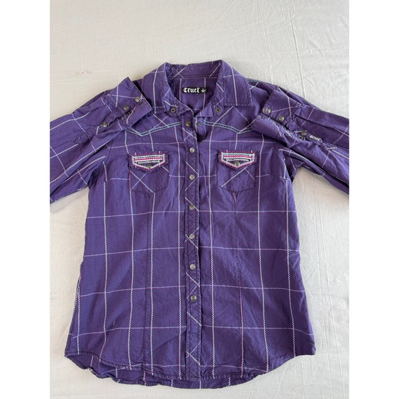 A stylish and unique Cruel Girl western shirt, perfect for adding a touch of cowgirl flair to your wardrobe. This long-sleeved shirt features a vibrant purple plaid pattern accented with turquoise and pink stitching. The design includes decorative embroidery on the chest pockets and shoulders, adding a distinctive western touch. The shirt is finished with snap closures on the front and cuffs, enhancing its classic western style. Ideal for casual outings, country-themed events, or adding a pop of color to your everyday attire.