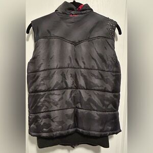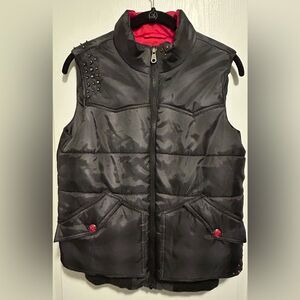 Lightly worn **Cruel Girl Puffer Vest** in **gray and red**, size **small**. Features **five pockets**, **rhinestone accents**, and a stylish quilted design. Measurements: **length 21 inches, armpit to armpit 18 inches**. Perfect for layering and adding a bold touch to any outfit.