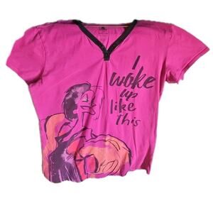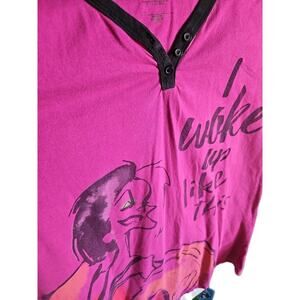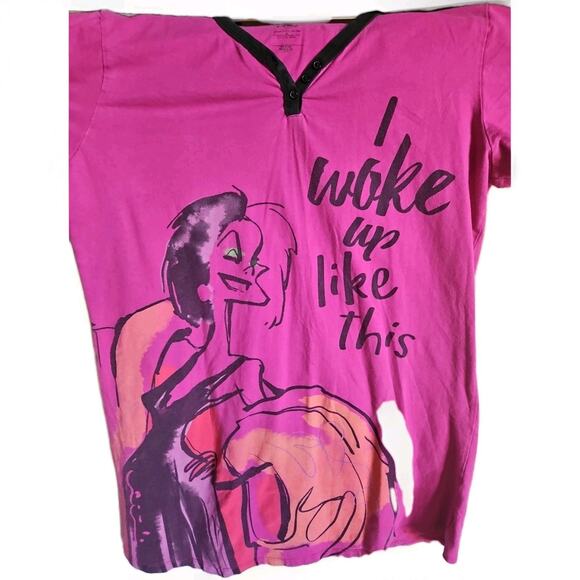 The Cruella DeVille Women's Nightgown from The Disney Store is a stylish and comfortable option for sleepwear. This V-neck gown features a graphic print of the iconic character Cruella DeVille, with accents of buttons adding a unique touch. Made of 100% cotton, this pink gown is lightweight, making it perfect for the warmer seasons of Summer, Fall, and Spring. Machine washable for easy care, this gown is a must-have for fans of Disney villains. This nightgown is a little faded from use, but no signs of piling, holes, or tears.