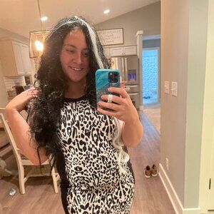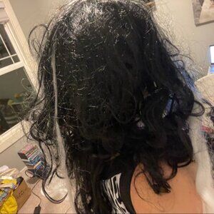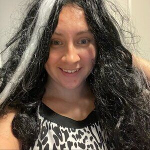 Details: Great for a Cruella Costume, Mostly black wig with a long white streak. The netting is slightly visible and this is not a top quality wig! I did try to comb it out a bit! Check out my closet for the dress I wore! Cruella de Ville wig, [an area on top where the black netting is exposed, hard to photograph] Halloween coming soon!