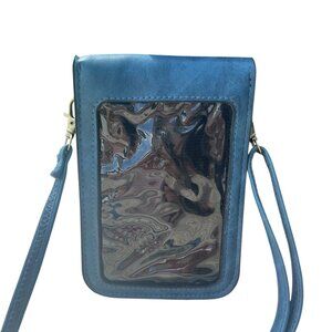 Beautiful blue floral cut-out leather crossbody bag from Cruise Club features a plastic pocket for a cell phone or passport, and a pocket for credit cards.