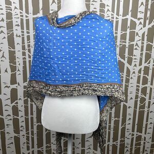 Ann Taylor LOFT Cruise Ready Cornflower Blue Polka Dot Scarf Wrap. Features lightweight 100% rayon fabric in a cornflower blue & white polka dot print with cognac brown stripe and black & tan abstract floral print edges, fringe trimmed ends. Gently worn and clean with no flaws to note. A great spring weight scarf in a pretty polka dot & floral print and it's so versatile - wear it over the shoulders as a wrap or around the neck as a scarf!