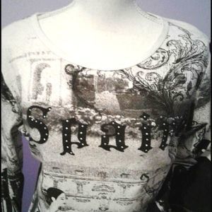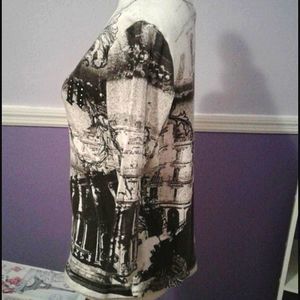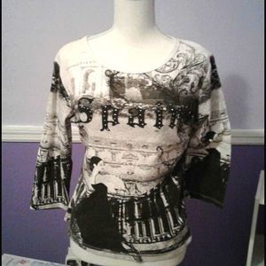 Black and white 3/4 sleeve sweater top with a Spain print. Crew neck. 100% cotton.