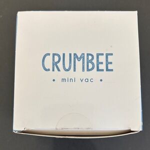 Crumbee mini vac packaging shown. White box with blue logo text. Clean, minimalist branding.