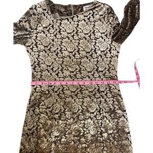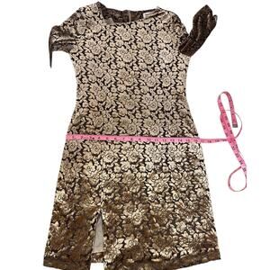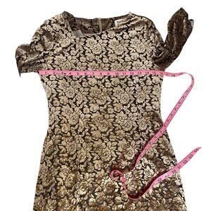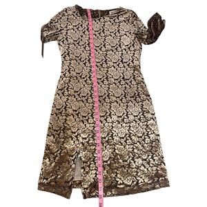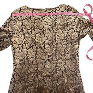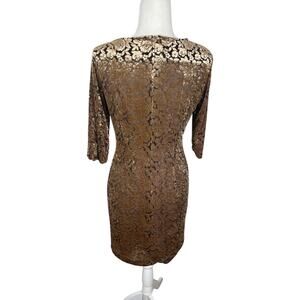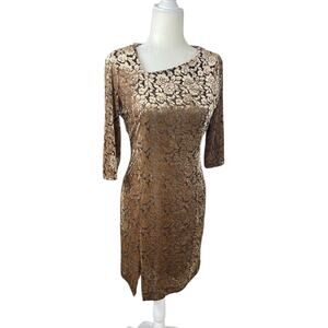 Crushed velvet burnout floral dress in brown and gold tones. Asymmetric neckline, 3/4 sleeves with split cuff. Sheath style. Fully lined with a back zipper. Please see photos for measurements.