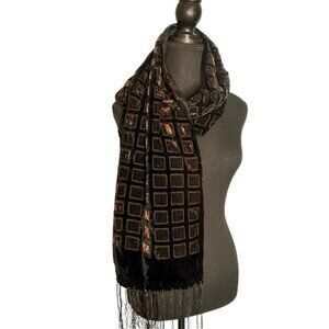 Crushed Velvet Checker Square Pattern Black Brown Scarf Sheer Fringe Silk