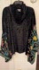 Beautifully crushed velvet black poncho with Embroidered floral design on sleeves. Armholes are divided so this poncho stays in place. This poncho is so soft to the touch you will love wearing it. Can be worn as a top or as outerwear. Wear over a camisole or sleeved top and pair with dressy pants or jeans.
