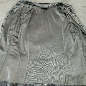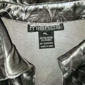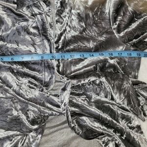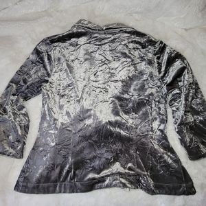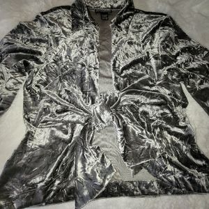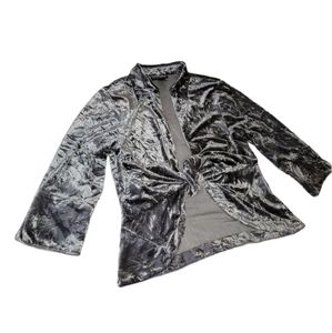 Beautiful crushed velvet cardigan by Mishca. Women's size Petite Large. Perfect layering piece for Christmas, holiday party, cocktail hour, weddings, mother of the bride / groom, or any special occasion. Silver Gray. Unstructured blazer. Lightweight Jacket.