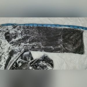 Tie closure in the front. Laid flat measures 19.5 inches from pit to pit and sleeves are 19 inches long from shoulder hem to wrist. Polyester spandex blend.