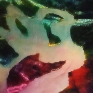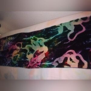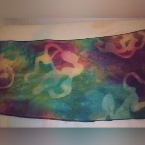 Abstract colorful designed velvet/silk scarf. Majestic array of color and artful design. Un-signed. Multi uses (hair wrap,neck scarf, purse handle wrap, waist belt.. etc!)