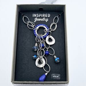 Cry Drop Dangle Statement Chain Necklace Blue Beaded Multi Artsy Silver Tone