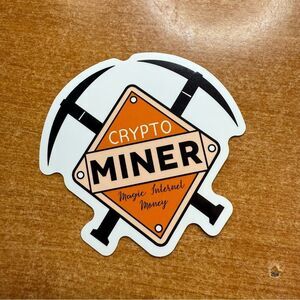 Crypto Miner sticker with pickaxe design. Features orange and black colors.