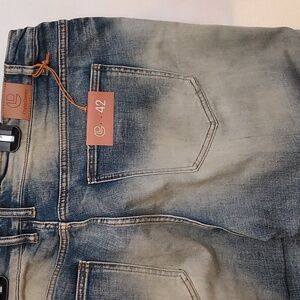 Crysp denim, size 42x33, front/back pockets, button/zip closure, distressed/patches, comes in manufacturing package, new with tags, very good condition