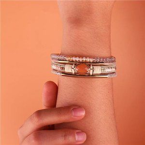 This stunning leather wrap bracelet is the perfect addition to any bohemian jewelry collection. Featuring shimmering crystal beads and unique stone charms, this bracelet is sure to catch the eye and add a touch of sparkle to any outfit.