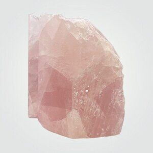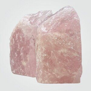 Two ends to make a pair of bookends in solid, natural, soft pink, rose quartz crystal. One-of-a-kind and will make a unique addition to your home. Featuring a high-shine finish to the front and inside of the bookends. The outside of the bookends are rough/unpolished Rose Quartz. These Geode Bookends have all of the natural qualities and markings associated with this unique stone. Add a boho chic touch to your bookshelf, table or office decor with these natural rose quartz stones hand-carved from Brazil.