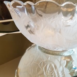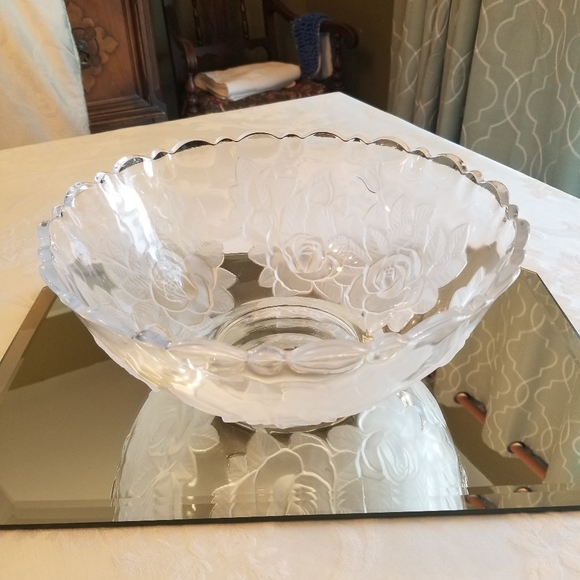 Crystal bowl with frosted floral design. 12" diameter 5" height. Scalloped trim.