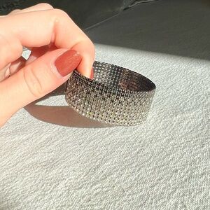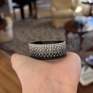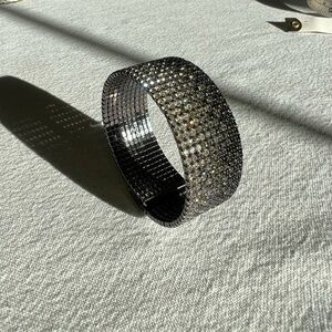 Ombré white to gray to black crystals on flexible silver tone 7” bracelet. Fits a smaller wrist. See photos. 7” long when pulled flat. See other pieces from the collection and create an arm party !!