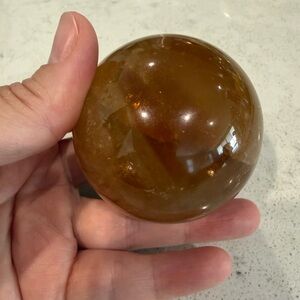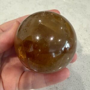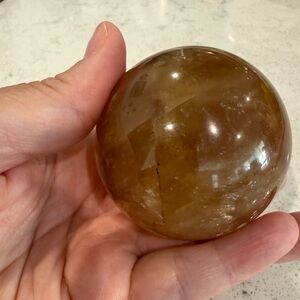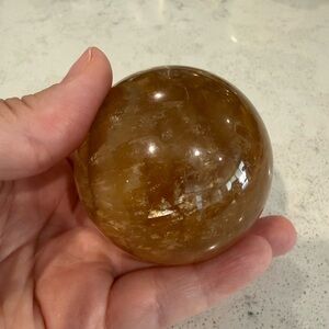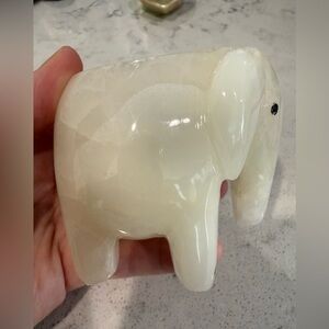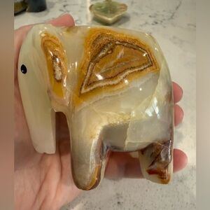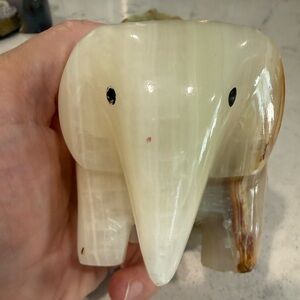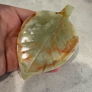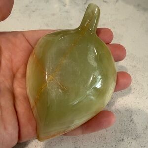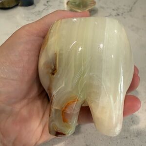 Polished green onyx elephant figurine holding an optical honey calcite sphere. Included is also a green onyx carved leaf dish. Warm honey calcite sphere balances on the elephant. Smooth glossy finish with natural stone banding. Decorative tabletop accent. Perfect addition to your collection. I can also separate the items if you prefer to purchase separately. Elephant is 3 1/2 inches, leaf is 4 inches and the sphere is 3 inches. Beautiful set.