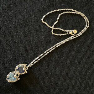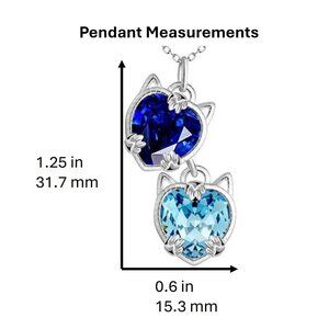 Adorable crystal cat charm necklace features sky blue and royal blue heart-shaped crystal charms in a sterling silver setting with tiny cat ears and paws. The pendant comes with a 17" sterling silver cable chain.