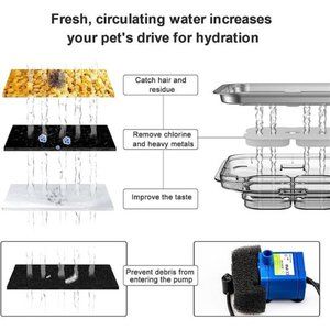 🧿[Circulating filtration system with 2 stages]: The circulating filtration system uses a replaceable round filter to purify the water, remove dirt and food particles plus a pre-filter sponge to catch the hair and debris. The round filter is composed of cotton layers, coconut shell activated carbons and ion-exchange resins. It provides fresh clean water to your lovely pets.