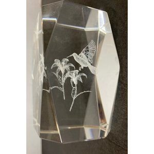 Crystal Clear Glass Cube Paperweight 3-D Laser Etched hummingbird flower lily