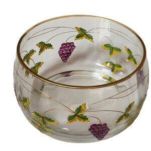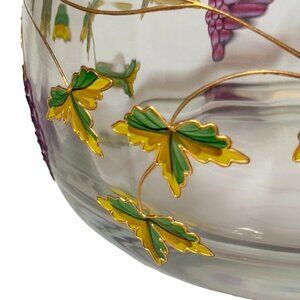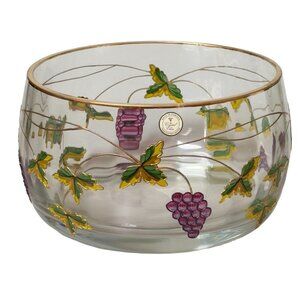 This multicolored, 9-inch Crystal Clear handcrafted crystal bowl is adorned with gold-gilded Venetian grapevine patterns. Its vintage design and hand-painted cloisonné glass add a touch of elegance to any setting.