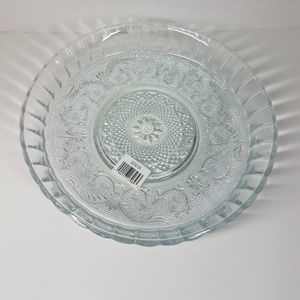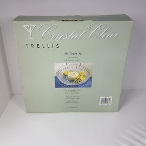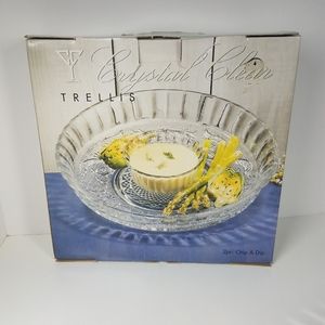 Beautiful intricate crystal clear serving dish. Made in Malaysia. Box shows this is a 2 pc however the small dip dish is not included. This listing is just for the 1 larger chip dish. The bottom of the dish has some dirt marks (as shown in photos) that is hard to remove.