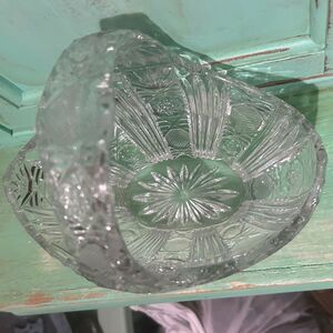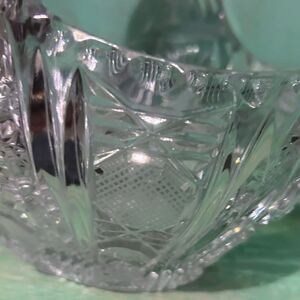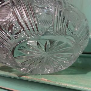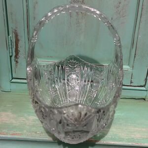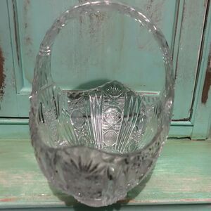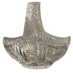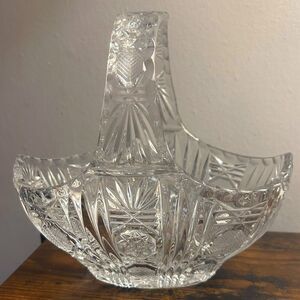Crystal Cut Glass Decorative Basket Bowl with Handle Vintage Candy Dish. Measures 8” L x 6” W at widest point, 8” H. In great vintage/pre-owned condition with no chips, cracks, or other imperfections.
