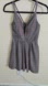 Shine in this elegant gray mini dress. Features a plunging neckline and sleeveless style. Ideal for evening events.