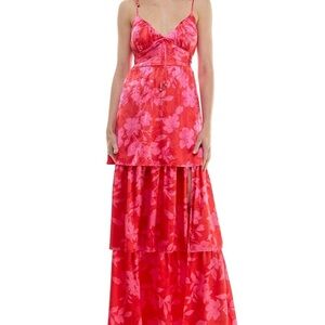 Step out in style with this stunning red maxi dress, featuring a beautiful floral pattern. Perfect for any occasion, this dress offers a flattering fit and a touch of elegance.
