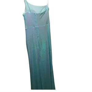 Dazzle in this one-shoulder sequin dress. Iridescent blue shimmer. Perfect for evening events.