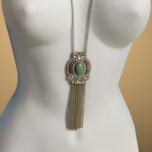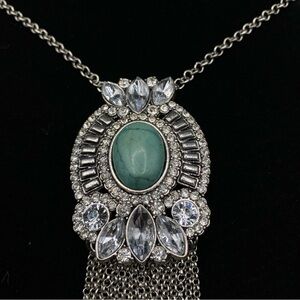 Crystal & Faux Turquoise Cabochon Necklace With Chain Dangles. Chain measures 33" + 4" extender chain. Pendant and dangles measures an additional 5". Very good condition, all rhinestones intact, very clean and appears barely worn if at all. #8