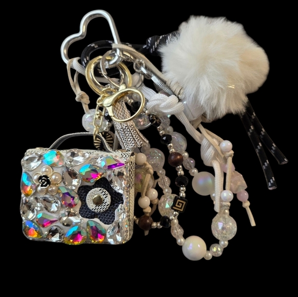 Dripping in sparkle and elegance, this hand-assembled crystal glam charm is the ultimate statement piece for your keys or handbag. Featuring a rhinestone-covered mini bag charm, white pom pom, layered beaded strands, and gold-tone accents, this beauty brings instant luxury to your everyday look.