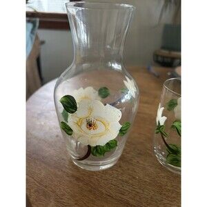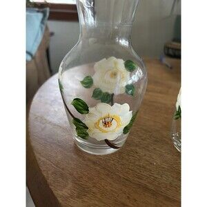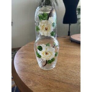 Crystal Glass Bedside Water Carafe With Water Glass Hand Painted Floral 16 Oz