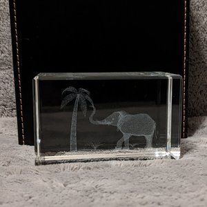 Crystal Glass Cube 3-D Elephant Palm Tree Safari Scene Laser Cut Paperweight