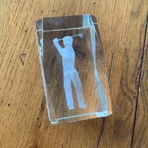A perfect gift for a dad who golfs. This crystal glass paperweight has a 3-D golfer etched on the inside for different looks at every angle. It’s about 3” tall with 2” base. Great condition and includes the carrying case.