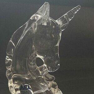 This Crystal Glass Unicorn Paperweight is a beautifully crafted piece of art crystal glass. The clear glass, featuring a unicorn theme, showcases a Mid-Century Modern style with a glossy finish. Hand-blown and handmade, this decorative paperweight adds a touch of whimsy and elegance to any space. It's a perfect addition to your UV glow light hutch as well. Perfect for collectors or those who appreciate unique and vintage pieces, this paperweight is a charming addition to any home decor setting. It's in new condition with no chips, cracks or bruising. In perfect condition.