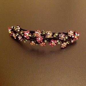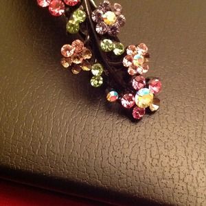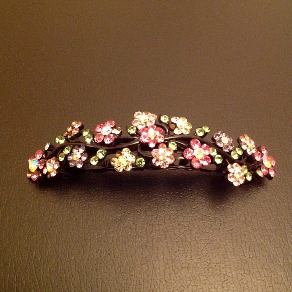 Pastel crystals form flower petals in this pretty hair clip. About 4 1/4 inches across. So pretty for a special occasion . Just noticed a couple crystals missing on one petal. See last photo.. Hard to tell.