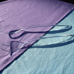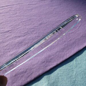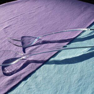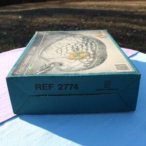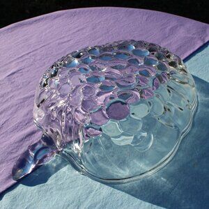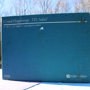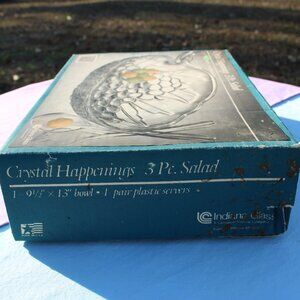 This 3 piece salad serving set consists of 1 pair of plastic server utensils, and 1 Large grape patterned salad bowl, measuring 9 1/5in. wide and 13in. long. Never used with no damage other than a stained box. The utensils have some weird lines in the plastic but they're not cracks. Really unsure what they are, shown in the last images. Made in the 1980s by "Indiana Glass".