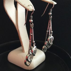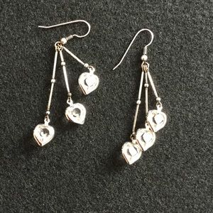 Three Heart-shaped Crystals set in Sterling Silver dangle from Silver tubes & beads on descending lengths. Fishhook ear wires with 2.5" drop length.