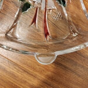 Elegant crystal bell-shaped dish featuring festive red and green accents. Perfect for adding a touch of holiday charm to your home decor. 6x7 inches. May be Celebrations Mikasa Holiday Bells. Very nice dish.