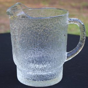 This 64oz. pitcher is made in the beautiful “Crystal Ice” pattern. Produced by “Indiana Glass” through the 1980s, this pattern is often referred to as “Tree Bark”. Measuring 8 1/2in. tall and 4 3/4in. wide at the base. This pitcher is a hefty 4lbs empty.