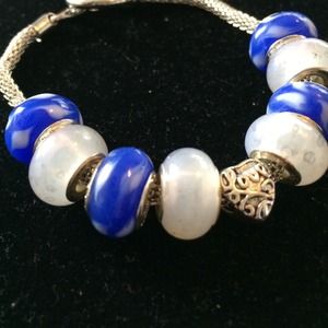 @sgallo I did get your message, but poshmark is acting up on my server right now for some reason! Do you mean the bracelet itself? It is silver. The beads are blue and a transparent white. I can tag you on my bead options so you can see all the blues and whites I have. Also you can pick out a custom charm if you like from my other closet ( @ms_unicorn ). All of my charms should be towards the bottom of my closet.
