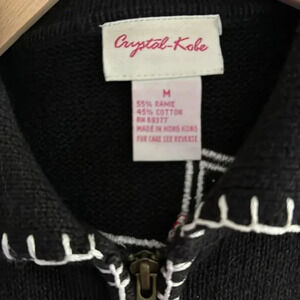 In excellent condition this holiday black sweater-has a zipper. from armpit to armpit is about 20 inches and 24 inches long. All items have been cleaned and comes from a smoke free home.