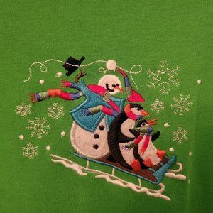 Crystal Kobe Size L Green Snowman Penguin Sledding Holiday LS Cotton T-shirt