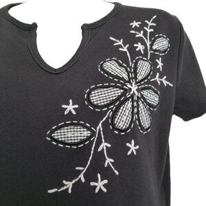 This vintage Crystal Kobe embroidered top brings authentic retro charm with its intricate white floral design against the classic black base. The gingham-patterned petals add a sweet vintage touch while the keyhole neckline keeps things feminine and flattering. Perfect for anyone who loves authentic vintage pieces with that handcrafted embroidered aesthetic.